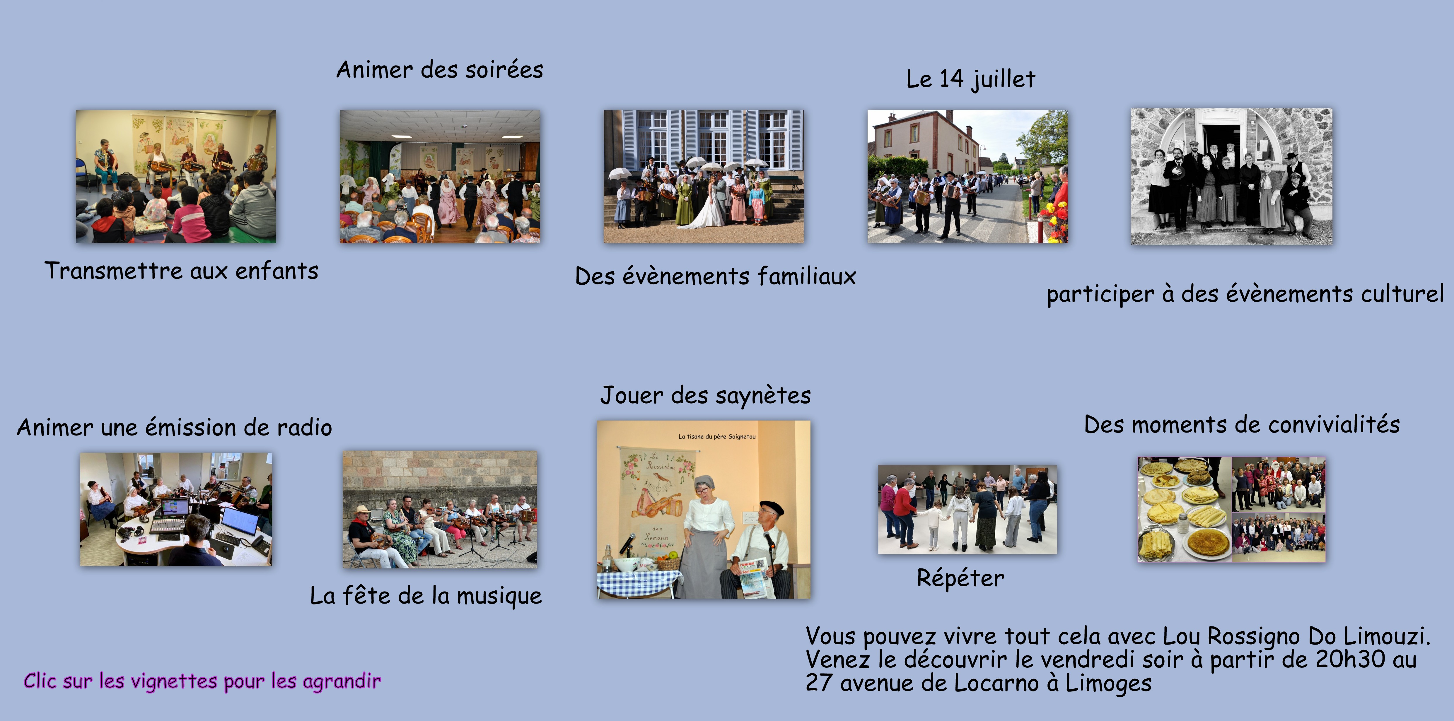 Nous sommes un groupe de bénévoles qui, unis par une même passion pour la tradition et la fête, anime des spectacles de qualité autour de la danse, de la musique, et de l’histoire des gens simples, ordinaires et merveilleux qui travaillaient la terre ou la forêt.